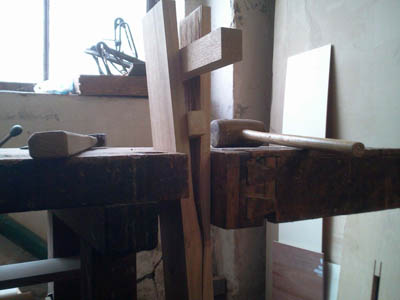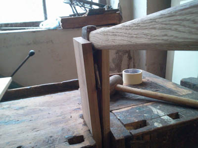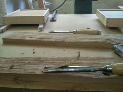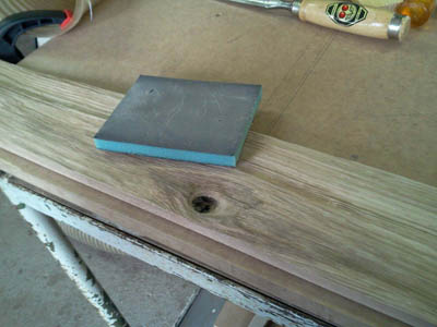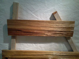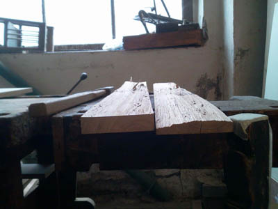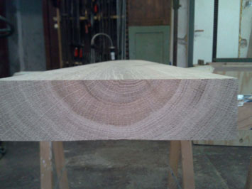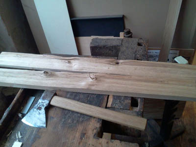 Das Ausgangsmaterial für die Front des Couchtischs ist ein Kernbrett, in dem sich auch das Kernholz farblich sehr vom Rest abhebt. Der Kern läuft Schräg hindurch, es sind außerdem zwei Äste darin und natürlich auch ein paar Risse. Und das ist auch gut so, den es wird eine Front die nur eine Funktion hat, so natürlich wie möglich auszusehen. Und zwar wie gespaltenes Holz. Die ganzen Merkmale die normalerweise dazu führen ein Holz auszumustern sind für diese Aufgabe genau richtig, es ist also auch ökologisch wertvoll.