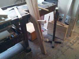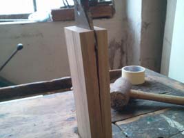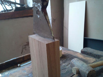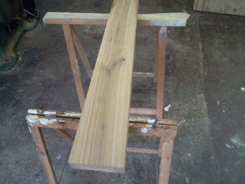 Das Ausgangsmaterial für die Front des Couchtischs ist ein Kernbrett, in dem sich auch das Kernholz farblich sehr vom Rest abhebt. Der Kern läuft Schräg hindurch, es sind außerdem zwei Äste darin und natürlich auch ein paar Risse. Und das ist auch gut so, den es wird eine Front die nur eine Funktion hat, so natürlich wie möglich auszusehen. Und zwar wie gespaltenes Holz. Die ganzen Merkmale die normalerweise dazu führen ein Holz auszumustern sind für diese Aufgabe genau richtig, es ist also auch ökologisch wertvoll.